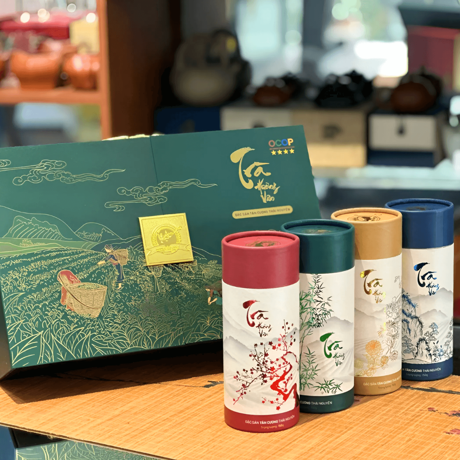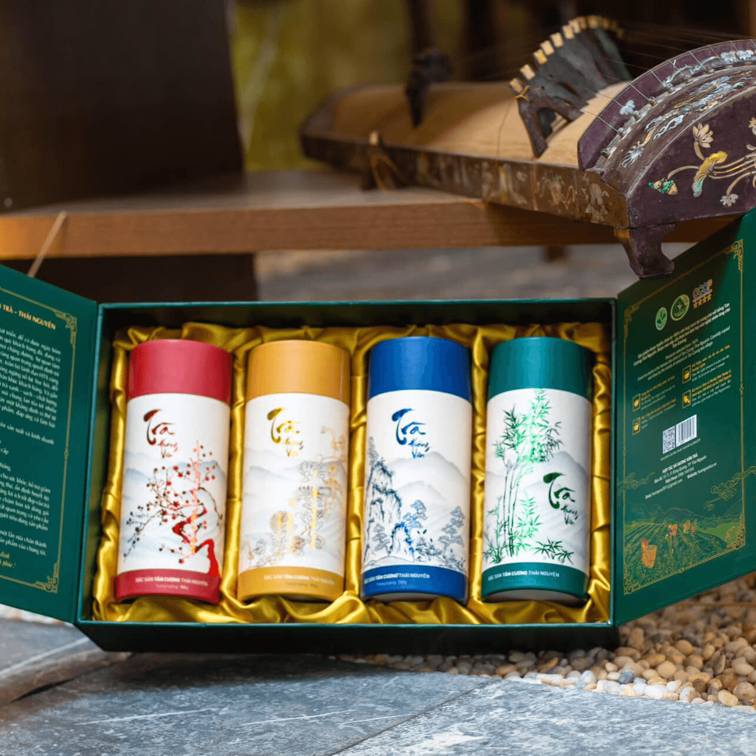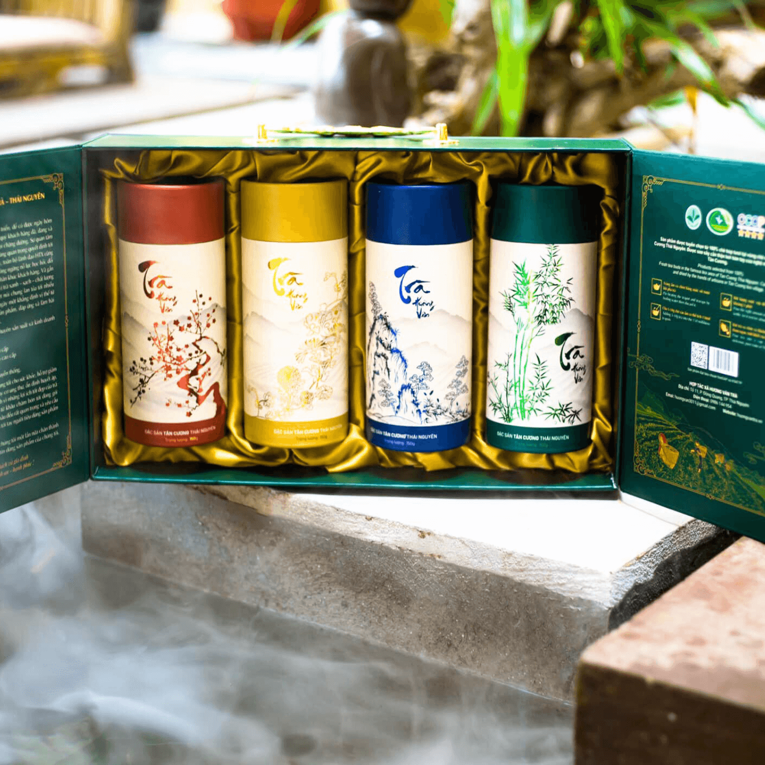 Và bộ sản phẩm gồm 4 trụ, 4 màu khácnhau và chứa đựng 4 dòng trà đặc trưng của vùng đất Tân Cương, Thái Nguyên